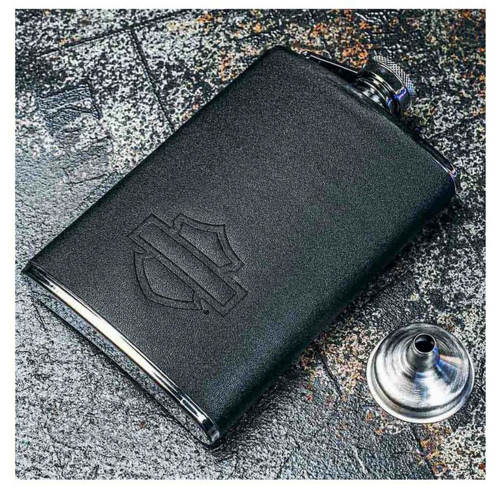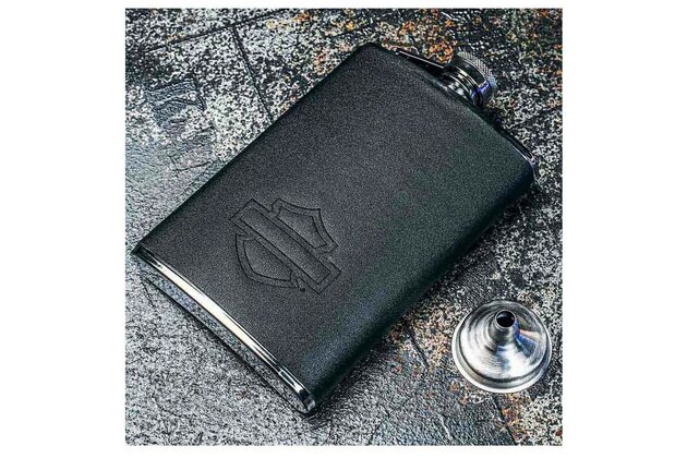 - robustní nerezová ocelová láhev s černým koženkovým obalem o objemu 240 ml má vyražené logo Open Bar & Shield.
